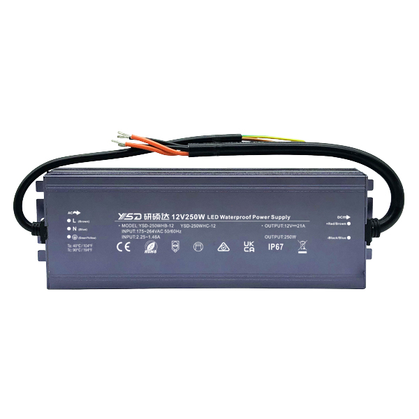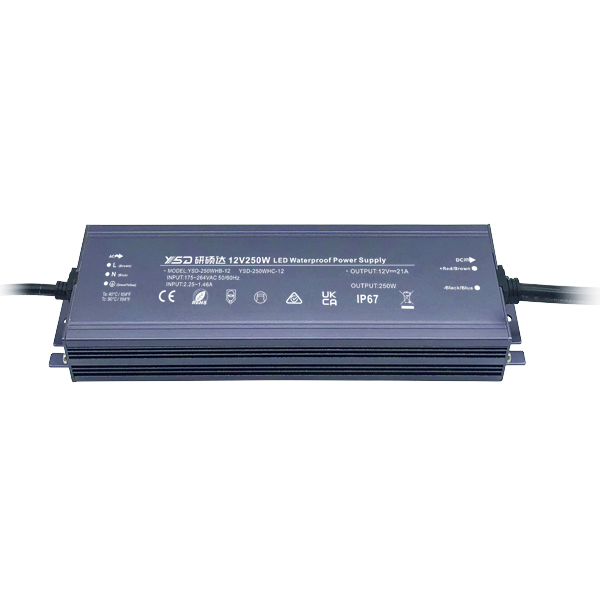 AC12V 250W POWER SUPPLY .YSD LED power supply is a professional manufacturing drivers company in China with over 15 years experience, YSD economic series -AB series of our IP67 waterproof power supply 24V 250W10.5A .Waterproof IP67 Thin Power Supply for Wash Wall, Fountain Lights with 3 years warranty,have CE ,ROHs ,BIS UKCA certificate;Passed EMC ,with anti-interference,anti-radiation;perfect choice for outdoor lighting project;input 170-264V/100-130V ,PF>0.6,could be used for outdoor decoration lighting , light strips,commercial light advertising board etc.Very good quality with excellent components inside