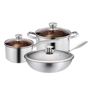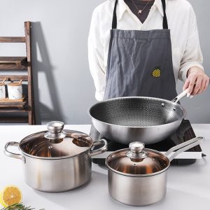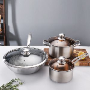 Product Material:201 Stainless Steel Packaging:OPP Transparent Bag + Gift Box with Handle Service:Accept OEM 3-Piece Stainless Steel Cookware Set, Composite Steel Saucepan, Soup Pot & Wok, Induction Ready, Non-Stick Honeycomb Wok Included