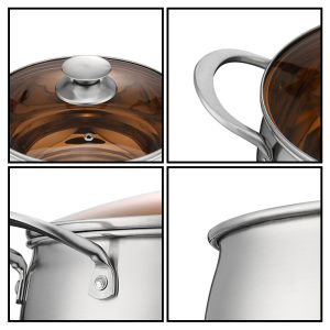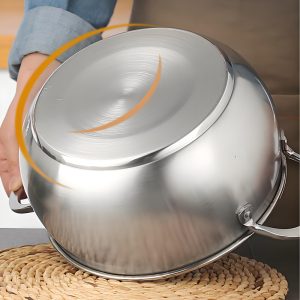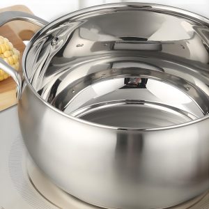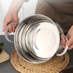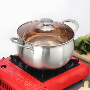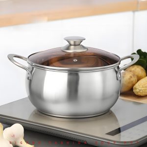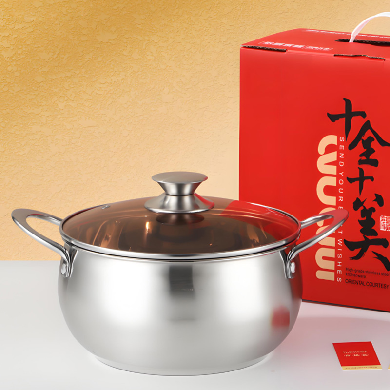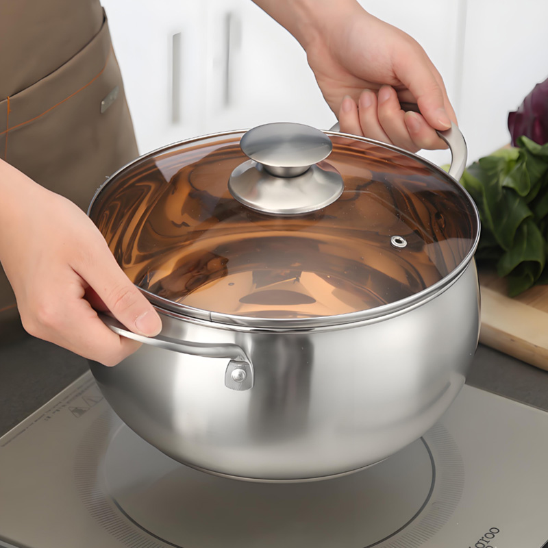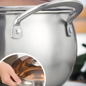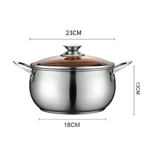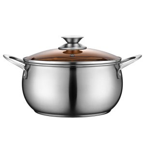 This thickened composite stainless steel pearl soup pot features double handles for safe use. It provides even heat distribution, is durable and easy to clean. Compatible with all stoves including induction cookers, ideal for daily cooking and soup making.