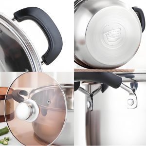 Made of 304 stainless steel, durable and easy to clean with mirror polish. Multi-purpose for steaming, boiling, simmering and stewing. Large capacity with tempered glass lid. Compatible with induction, gas, infrared and electric ceramic stoves
