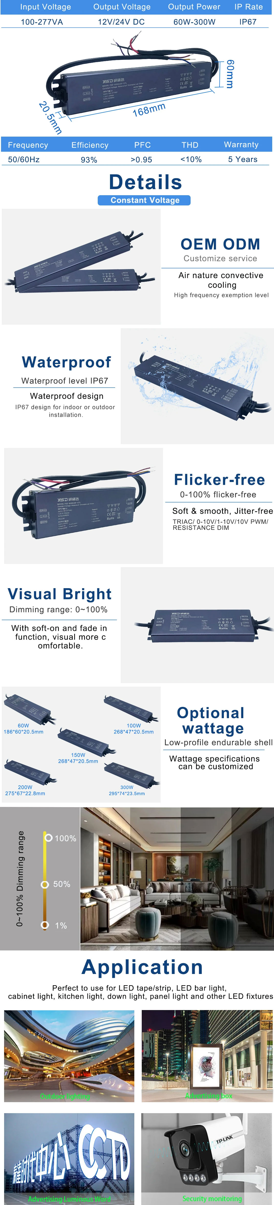 High PF>0.95 wide range input voltage 100-277v flicker-free DC 12V 300w 200w 100w dimmable slim power supply with dimmers