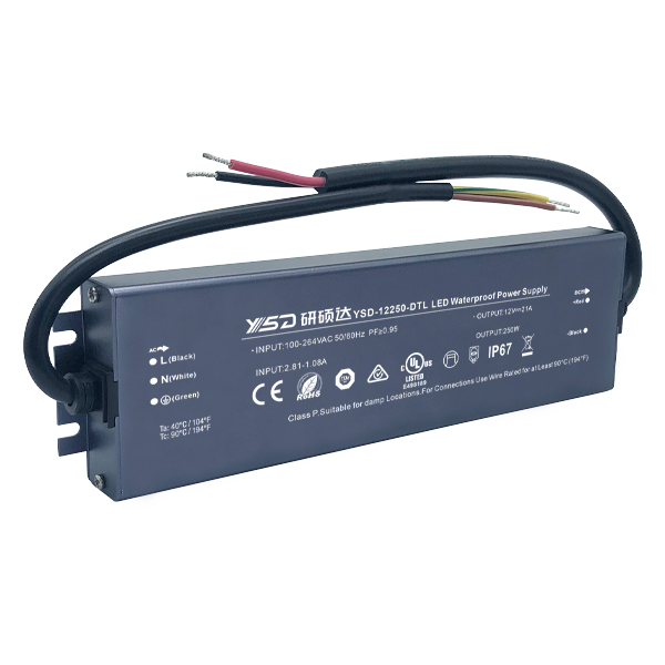 YSD new series -D series of our IP67 ultra thin waterproof LED driver/ 12V power supply ,24V dc power supply /250W driver,with 5 years warranty ;have CE ,ROHs ,BIS ,SAA,CB,TUV UL certificate;New design for easier installation,with height only have 18mm ,perfect choice for small space indoor or outdoor lighting project;input 100-277V ,PF>0.95 .could be used for indoor home decoration lighting , light strips,commercial light advertising board ,professional project power supply etc