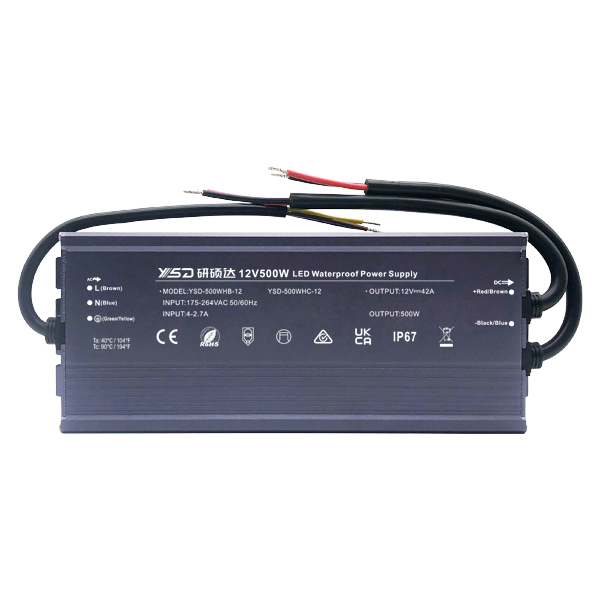YSD LED power supply is a professional manufacturing drivers company in China with over 15 years experience,YSD economic series -AB series of our IP67 waterproof power supply 24V 500W 20.8A .LED signs outdoor power waterproof drivers with 3 years warranty ,have CE ,ROHs ,BIS certificate;Passed EMC ,with anti-interference,anti-radiation;perfect choice for outdoor lighting project;input 170-264V/100-130V ,PF>0.6,could be used for outdoor decoration lighting , light strips,commercial light advertising board etc.Very good quality with excellent components inside