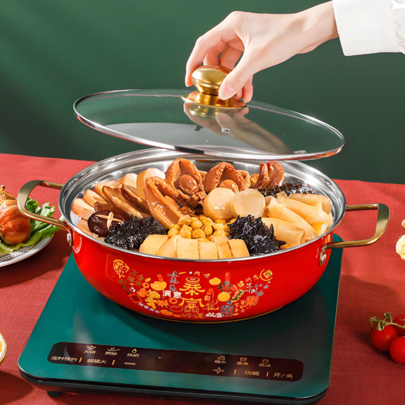 Thickened stainless steel hot pot with fish scale bottom, non-stick, fast heating, even heat conduction. Ideal for Buddha Jumps Over the Wall, seafood, hot pot and heating food. Compatible with induction cookers.