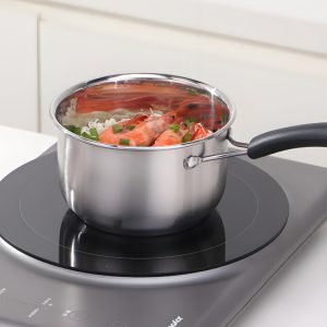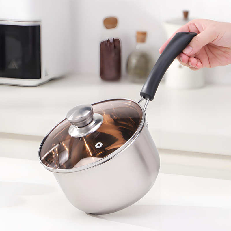 Thickened composite stainless steel milk pan, fast even heating, rust-resistant and easy to clean. Ideal for milk, soup and baby food, compatible with all stovetops.