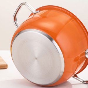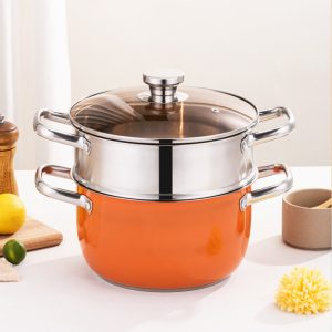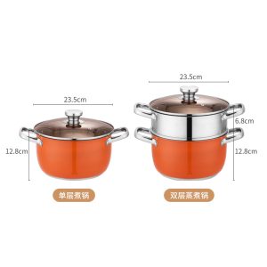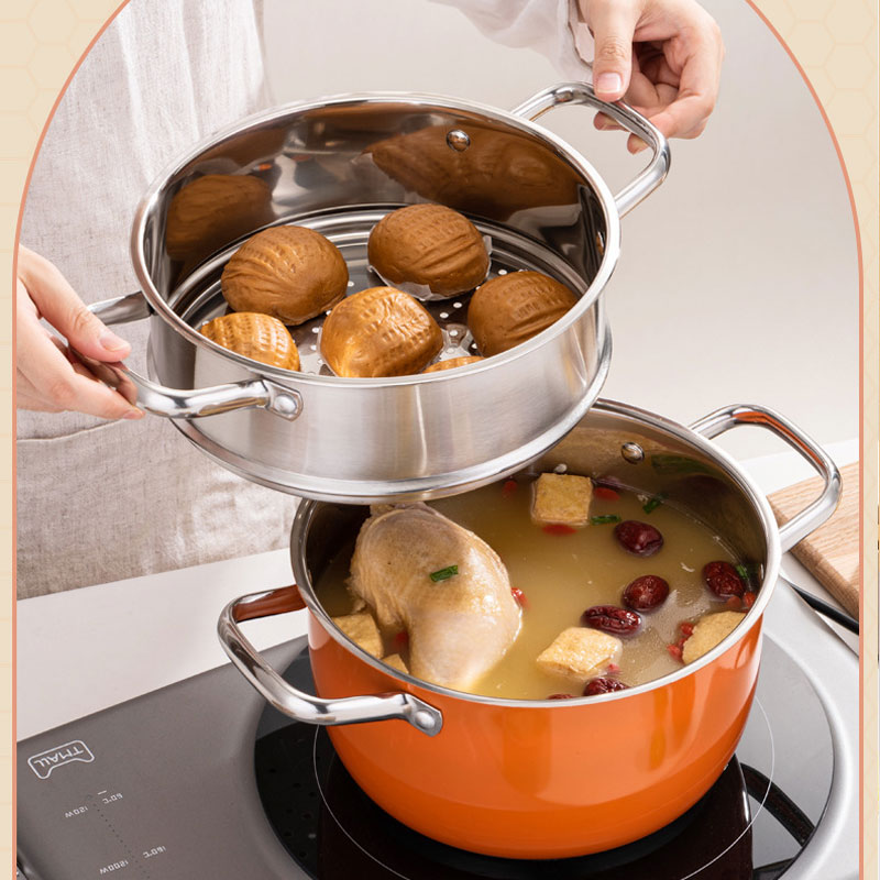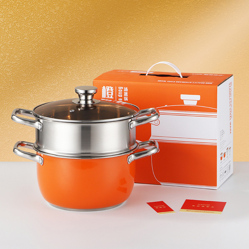This thickened stainless steel soup steamer features a multifunctional orange design with large capacity for home use. It is ideal for steaming, boiling and soup making, with even heat distribution and durable construction. Compatible with induction cookers, gas stoves and other heating sources, perfect for daily family cooking.